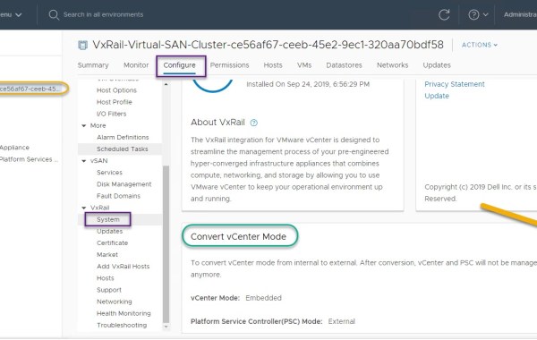 Previous post: VxRail 4.5 – View version vCenter HTML Client: From the vSphere client navigate to Cluster->Configure->VxRail->System ESXi SHELL: You can check the installed VxRail code from the ESXi host SHELL […]